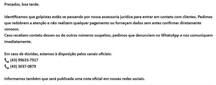 Eles utilizam imagens clonadas da logomarca do escritório por meio dos telefones 43-92001-7786 e 43-92001-7787.