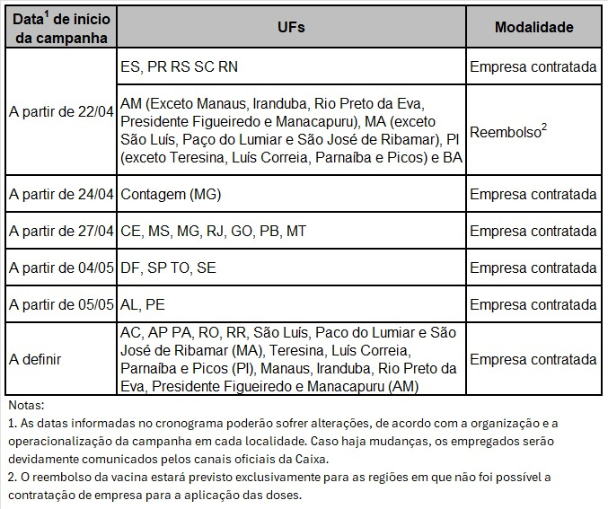 Como ocorre tradicionalmente, a Caixa realiza processo de licitação para contratar empresas responsáveis pelo fornecimento e aplicação das doses. Nos locais onde não houve empresas habilitadas, será adotado o sistema de reembolso, garantindo que todos os empregados tenham acesso à vacina. O valor máximo para ressarcimento é de R$ 180 por pessoa.