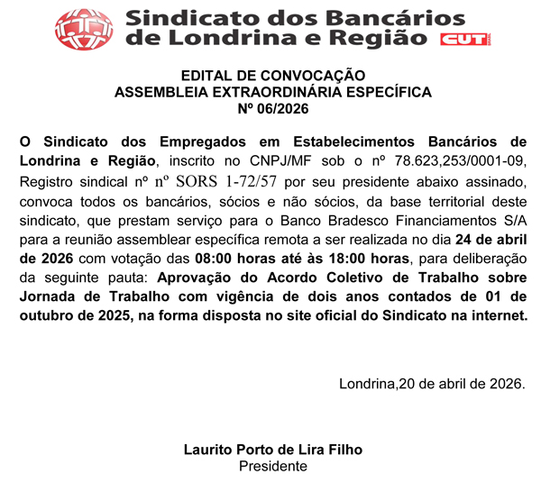 O Acordo Coletivo de Trabalho sobre a jornada de trabalho dos funcionários e funcionárias do Banco Bradesco Financiamentos estará em votação na Assembleia Geral Extraordinária convocada pelo Sindicato de Londrina para o dia 24 de abril.