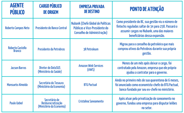 • Do setor público para o privado: Quando um ex-ministro, diretor de agência reguladora ou presidente de estatal assume um cargo em uma empresa privada que foi diretamente impactada por suas decisões.