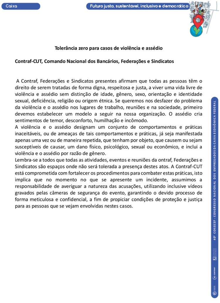 As entidades ressaltam que “se queremos nos desfazer do problema da violência e do assédio nos lugares de trabalho, reuniões e na sociedade, primeiro devemos estabelecer um modelo a seguir nesta nossa organização” e observam que “o assédio cria sentimentos de temor, desconforto, humilhação e incômodo” e que “todas as atividades, eventos e reuniões da Contraf, Federações e Sindicatos são espaços onde não será tolerada a presença destes atos”.